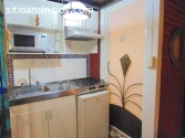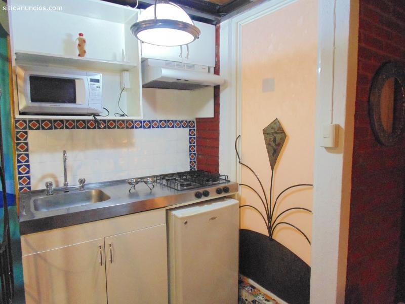2 Camas matrimoniales, una cocineta ya equipada con utensilios de cocina y vajilla, baño, microondas, plancha independiente, desayunador, y baño completo en la habitación.