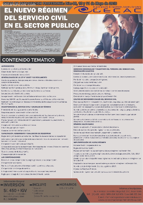 CURSO DE CAPACITACION PROFESIONAL: Días 09, 10 y 11 de Mayo de 2018EL NUEVO RÉGIMEN DEL SERVICIO CIVIL EN EL SECTOR PUBLICO