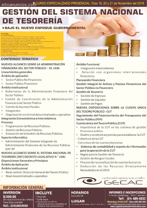 CURSO ESPECIALIZADO PRESENCIAL: Días 19, 20 y 21 de Noviembre del 2018GESTIÓN DEL SISTEMA NACIONAL DE TESORERÍA