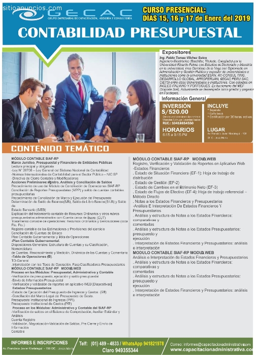 CURSO PRESENCIAL: DÍAS 15, 16 y 17 de Enero del 2018CONTABILIDAD PRESUPUESTAL