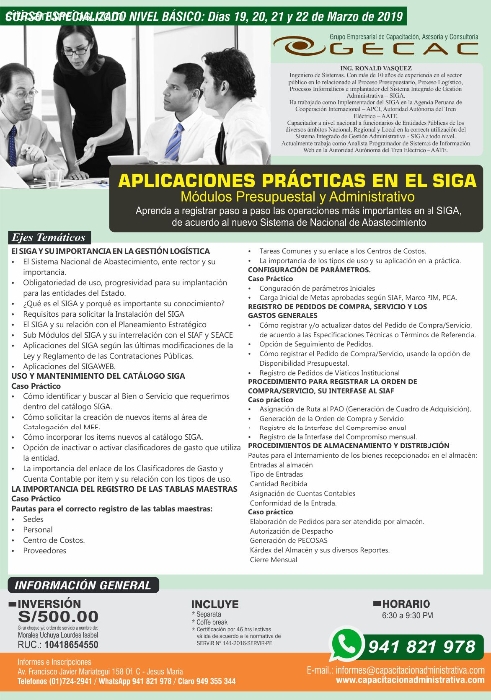CURSO ESPECIALIZADO NIVEL BÁSICO: Días 19, 20, 21 y 22 de Marzo de 2019APLICACIONES PRÁCTICAS EN EL SIGA