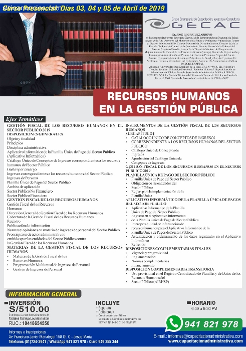 Curso Presencial: Días 03, 04 y 05 de Abril de 2019RECURSOS HUMANOS EN LA GESTIÓN PÚBLICA