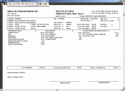 SISPLANI SQL emite Boletas de Pago de los diferentes tipos de Planillas, sean estas de Ejecutivos, Empleados, Obreros, Eventuales, Contratados ,etc. Tenemos versiones especiales para Construcción Civil y Profesores por hora (Institutos, colegios, etc). Nuestro sistema funciona en un ambiente totalmente visual, la base de datos es SQL, por lo que permite cualquier cantidad de trabajadores y conceptos de planilla en ella, ésta puede residir en un servidor, si usted prefiere, para su mejor administración y seguridad. Sisplani puede operar dentro de una oficina o en varias sucursales de un negocio a través del país pues permite la interconexión por internet.
