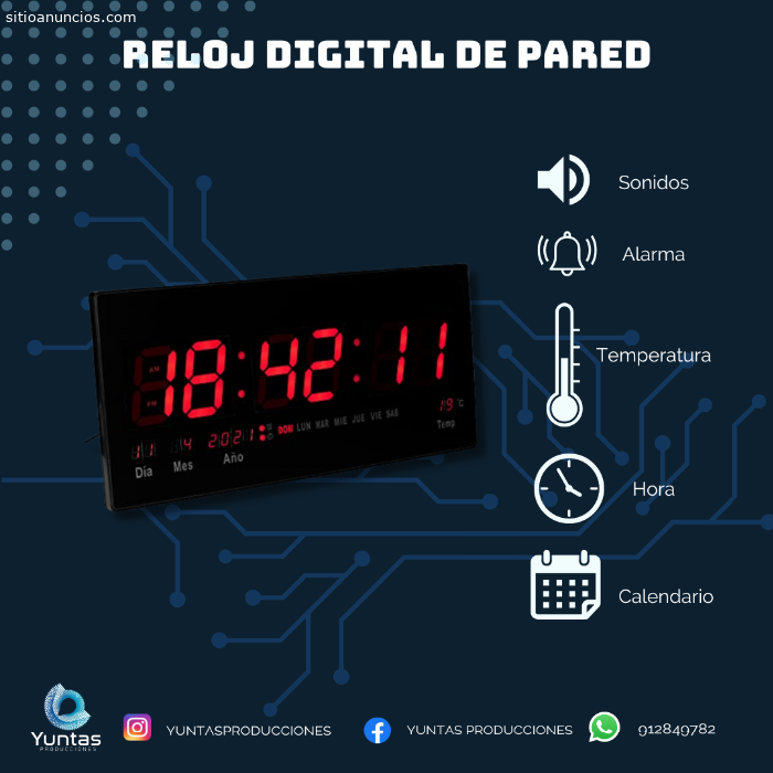 Reloj digital - Termómetro - Calendario LED. Montaje de gran tamaño, ya sea en pared o sobre mesa. Muestra los minutos, el año, el mes, la fecha, la temperatura y la hora. También tiene reloj despertador. Adaptador de funcionamiento 110-220 V CA / 5 V 500 mAh. Apto para comercios, iglesias, cafeterías, oficina, ideal para oficinas, gimnasios, hogares y comercio en general etc.Envíos a todo el Perú. Para más información, escríbenos al: https://wa.me/51912849782 o ingresa a nuestra página web: h
