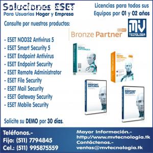Soluciones ESET* - Para Usuarios Hogar y Empresa(*)Licencia para todos sus equipos por 01 y 02 años.