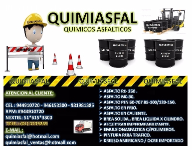 QUIMIASFAL PERU TE OFRECE LOS MEJORES PRODUCTOS ASFALTICOS PARA TUS OBRAS DE CONSTRUCCION . PRODUCTOS DE OPTIMA CALIDAD , Y CON LA GARANTIA QUE BUSCAS, CUMPLIENDO ASÍ LAS EXPECTATIVAS DE NUESTROS CLIENTES, TENEMOS A LA VENTA PRODUCTOS TALES COMO:ASFALTO EN FRIO,CALIENTE RC-250