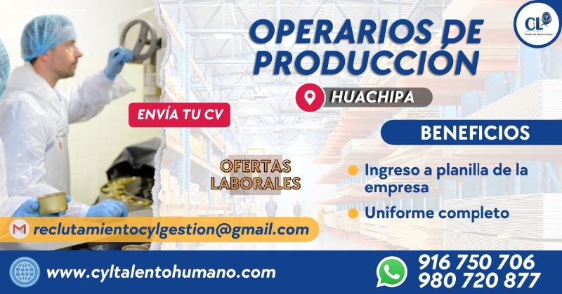 Importante empresa panificadora requiere operario de producción en empresas alimentos requiere operarios de producción para su sede de Huachipa.Enviar su CV al correo reclutamientocylgestion@gmail.com o al 961866531.