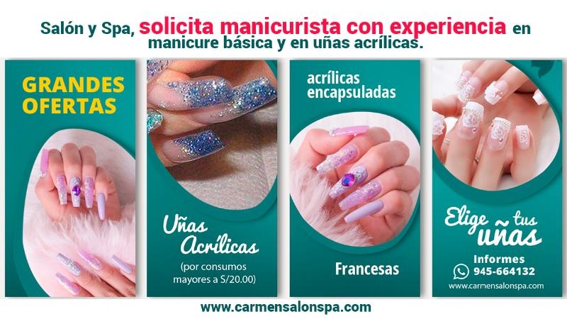 Salón y Spa, solicita manicurista con experiencia en manicure básica y en uñas acrílicas. Con trato amable y buena atención al cliente.Requisito: Que viva en el distrito de San Juan de Lurigancho