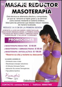 Masoterapia, Drenaje Linfático, Gimnasia Pasiva, Ultrasonido, Yeso terapia, Termoterapia, chocolaterapia, Crioterapia, tratamientos anti celulíticos, reafirmantes y otros.