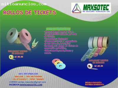 ROLLOS DE TICKETS,ROLLOS TERMICOS,PAPEL AUTOCOPIATIVOSe venden rollos de ticket de 2 y 3 dígitos para dispensador, papel autocopiativo y papel térmico de 80 x 80 para impresora térmica.