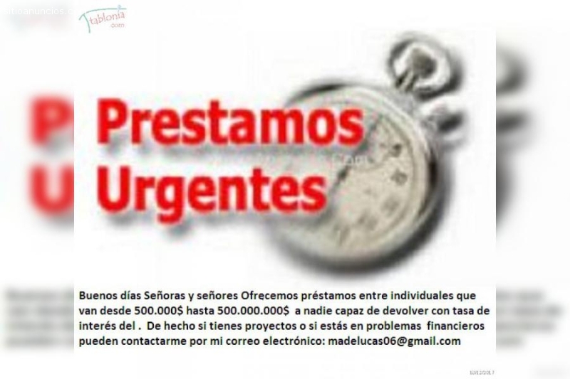 Soy un particular serio y honesto que concede ***** de dinero que van de 2. 000 $ a 100. 000. 000 $ tienen todaslas personas que es en el están a la búsqueda de ***** de dinero para cubrir una necesidad, regular una deuda,
