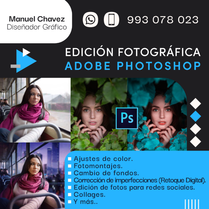 Hola que tal, mi nombre es Manuel Chavez del distrito de San Miguel, soy Diseñador Gráfico, especialista en Photoshop con varios años de experiencia.Brindo los servicios de edición y retoques fotográficos en la modalidad de freelance para personas particulares, negocios o empresas.