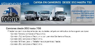Servicio y Alquiler de Transporte de Carga Pesada y Liviana desde Caracas a nivel nacional en Camiones 350, Camiones 600, Camiones 750, Camiones Toronto, Camiones NPR, Camiones Brazo Pickman, Camiones Brazo Hidràulico, Gandolas, Gandolas 30 Toneladas, Grúas Telescópicas, Montacargas, Lowboy y Maquinaria Extradimensionada. Préstamos servicios en los Puertos de Guanta, Puerto Cabello, Maracaibo, La Guaira, San Antonio, Guarero. Nuestras principales zonas de influencia: Maracaibo, Puerto Cabello,Página web: