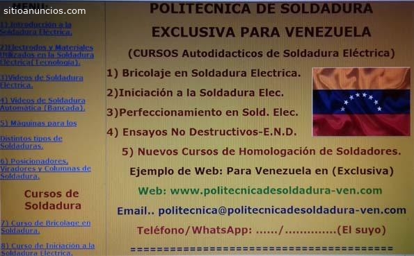 Negocio en Exclusiva, para Toda Venezuela, y puede llevarse desde cualquier pueblo ó ciudad, Web www.politecnicadesoldadura.comNegocio de Formación a Distancia con 3 Cursos de Soldadura + 1 E.N.D. , Auto-didácticos (El Profesor en tu casa) y 4 Cursos de Homologación de Soldadores en 1G, 2G, 3G y 4G (Para el mes de abril y se le entregaran sin coste alguno) con 11 Tipos de Máquinas de Soldadura de Importación recientemente incorporadas. Está previsto que para finales de año, salgan otros 8