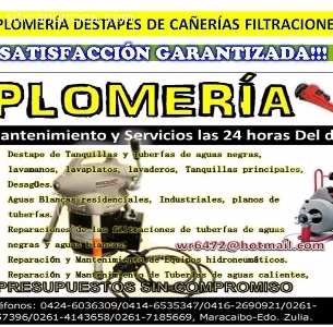 Servicio Integral de Plomeria Ofrecemos Servicios de Destapes, Instalaciones y Reparaciones de Tuberías, Salas Sanitarias, Hidroneumáticos, Lavaplatos, Drenajes de Lluvias, Lavaderos, Tanquillas, Lavamanos, Desagües Contamos con Técnicos con más de 30 años de Experiencia Realizamos Trabajos en Maracaibo, Cabimas y Ciudad Ojeda.Números de Contactos: