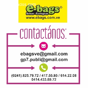 E-Bags Bolsas Ecológicas es una marca venezolana que diseña, fabrica y comercializa bolsas de tela no tejida, comprometida con la concienciación del público nacional sobre la problemática del uso de las bolsas plásticas en las diferentes actividades comerciales.En Venezuela, E-Bags Bolsas Ecológicas esta actuando para informar y ofrecer la opción de bolsas reutilizables como alternativa óptima para éste problema que nos afecta tanto como a otros países.